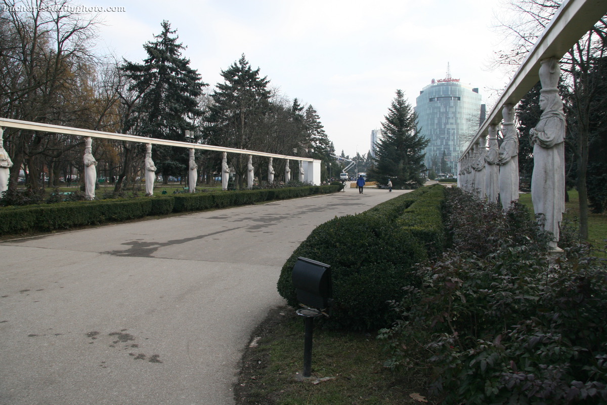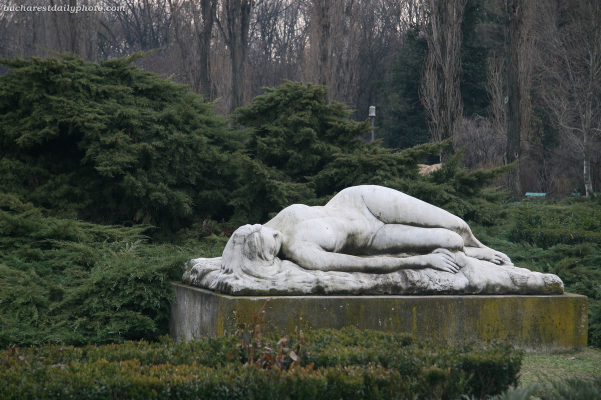 Because one of the photos from the “Winter in the park” series has raised some questions I decided to show the entire work of art that contains that statue, work that was clipped by my framing. The ensemble is called “The Alley of the Cariatides” by Constatin Baraschi (November 17, 1902 – March 22, 1966) and consists of two strings of 10 statues on each side of the alley. The statues represent Romanian peasant women, dressed in traditional clothing and carrying an amphora on their heads. There are two types of statues and they are differentiated by the position of their hands. The work was unveiled in 1936 but what we see today is not the original, which was destroyed during communism to make space for a statue of Stalin, but a reconstruction done in 2005 using the original molds. I don’t know how correct this information is but I’ve also read on the web that “The Alley of the Cariatides” caused quite a stir when it was originally unveiled, stir determined by two facts: first, that this was a classical arrangement but the subjects were peasants and second, the fact that the peasants were barefoot.