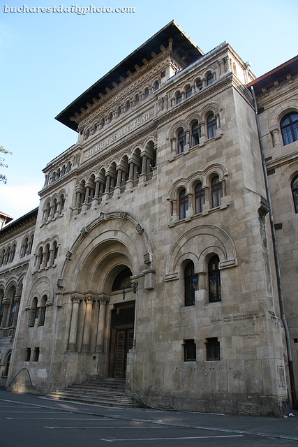 A few steps away from University Square, behind a little square with a fountain, lies the building of the School of Architecture. The building is a hybrid, with an old wing and two new ones. The old wing, which appears in today’s photo, was designed by architect Grigore Cerchez in 1912 in the tradition of Brâncovenesc style, an architectural style developed in Wallachia (historical province of Romania located south of the Carpathians mountains) during the reign of Constantin Brâncoveanu (1688-1714), style which that mixes Eastern and Renaissance motifs, with richly ornate pillars and in this case a heavily decorated facade. This building was dedicated to Ion Mincu, which is considered to be one of the greatest Romanian architects. The two new wings of the building were added between 1963 and 1968. Initiated by the society of Romanian Architects in 1892, the School of Architecture became a state institution in 1897 and reached the university statues in 1904. Today Ion Mincu University of Architecture and Urban Planning, to name its official title, has departments of Architecture, Urban Planning, Restoration and Interior Design.